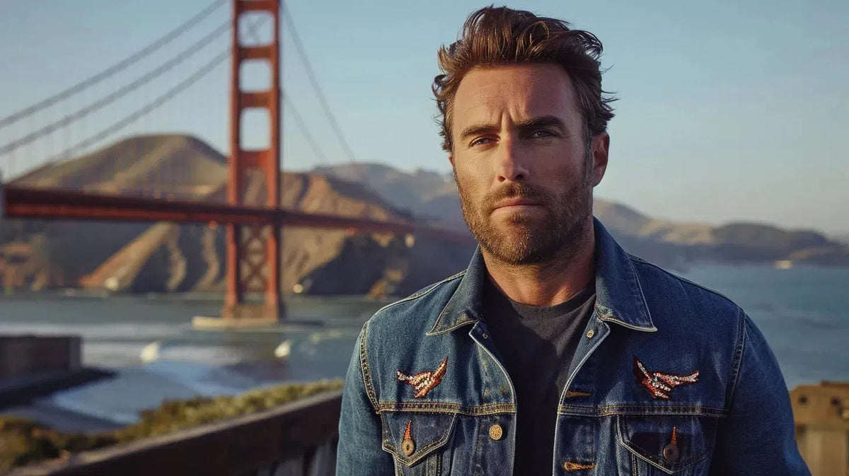 Embroidered men's denim jacket, sophisticated style, Golden Gate Bridge backdrop. Late Winter  season.